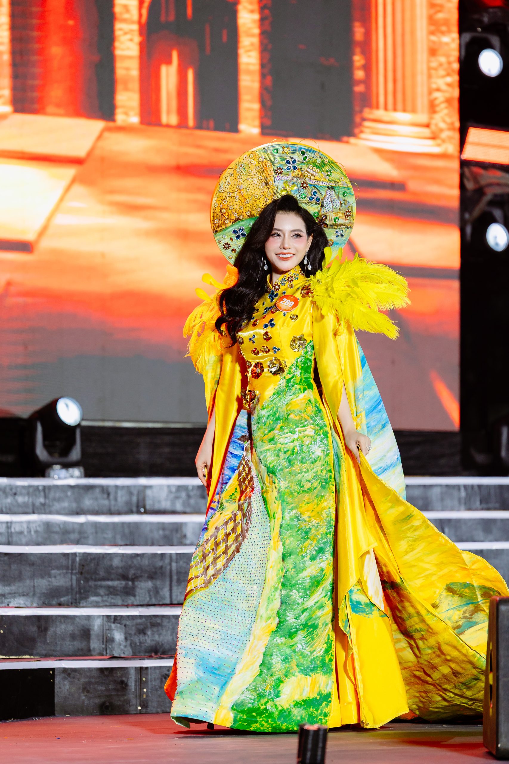 Tiếp theo phần thi trang phục áo dài, các thí sinh duyên dáng sải bước trong BST “Quý cô phố núi” của NTK Tony Phạm. Trên nền lụa trắng tinh khôi, phom áo dài truyền thống được tôn dáng bằng những họa tiết hoa hồng đính đá thủ công với sắc đỏ, cam, vàng, xanh,.. như những đóa hoa xuân bung nở giữa cao nguyên. Đường thêu tinh xảo kết hợp ánh pha lê tạo hiệu ứng lấp lánh. Điểm nhấn mềm mại là áo choàng voan lụa xanh lam đính sợi ánh kim, khắc họa hình ảnh quý cô doanh nhân thanh lịch, đậm nét truyền thống.