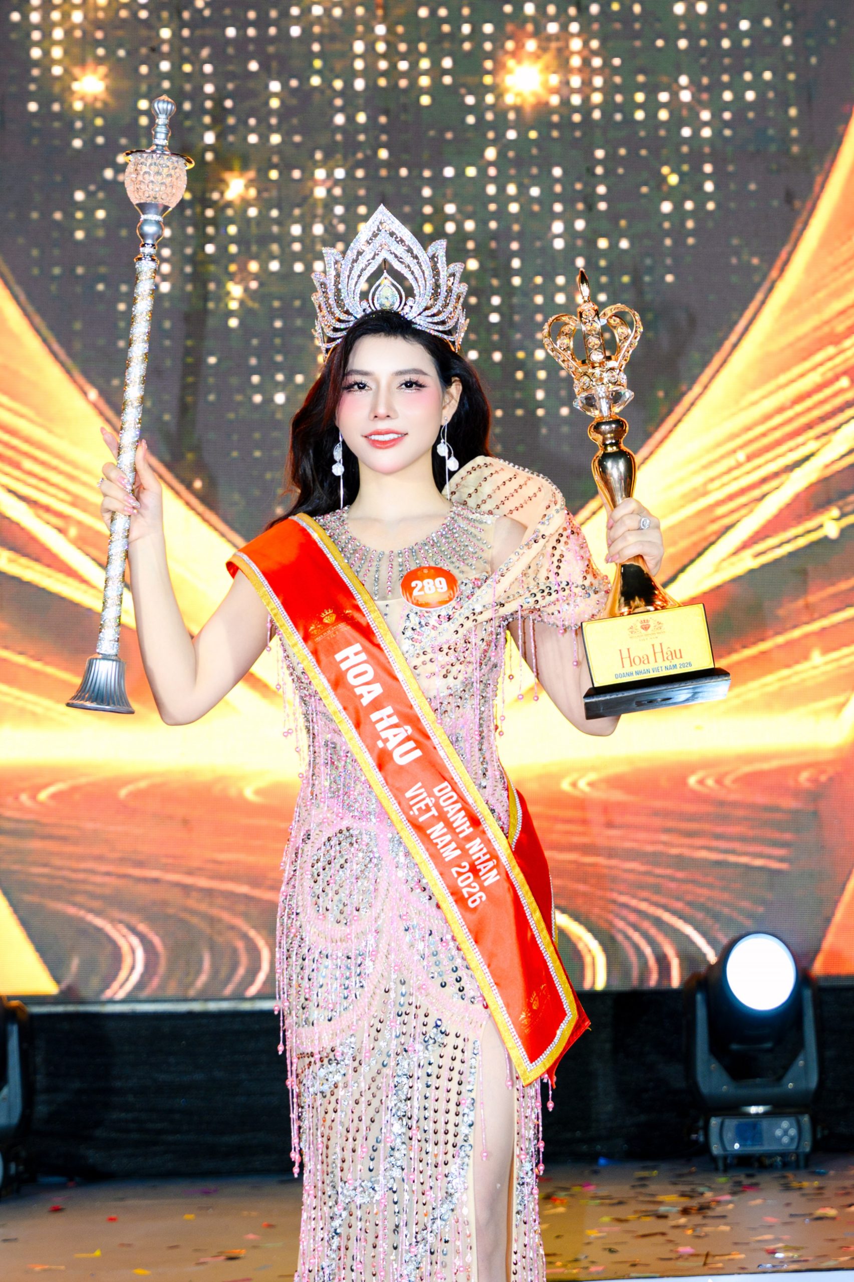 Vinh dự ấy được trao bởi Trưởng BTC – Hoa hậu Đại sứ Toàn cầu Hạnh Nguyên, Trưởng Ban Giám khảo – Danh ca Ngọc Sơn, Chủ tịch Miss VietNam Business – ca sĩ Thanh Thảo, cùng đương kim Hoa hậu Doanh nhân Việt Nam 2025 – Hoàng Thu Thủy. Dưới ánh đèn sân khấu, khoảnh khắc chiếc vương miện được nâng lên và đặt trên mái tóc tân hậu tựa như ánh sao rơi xuống giữa đại ngàn, đánh dấu sự ra đời của một biểu tượng mới trong cộng đồng nữ doanh nhân Việt Nam.