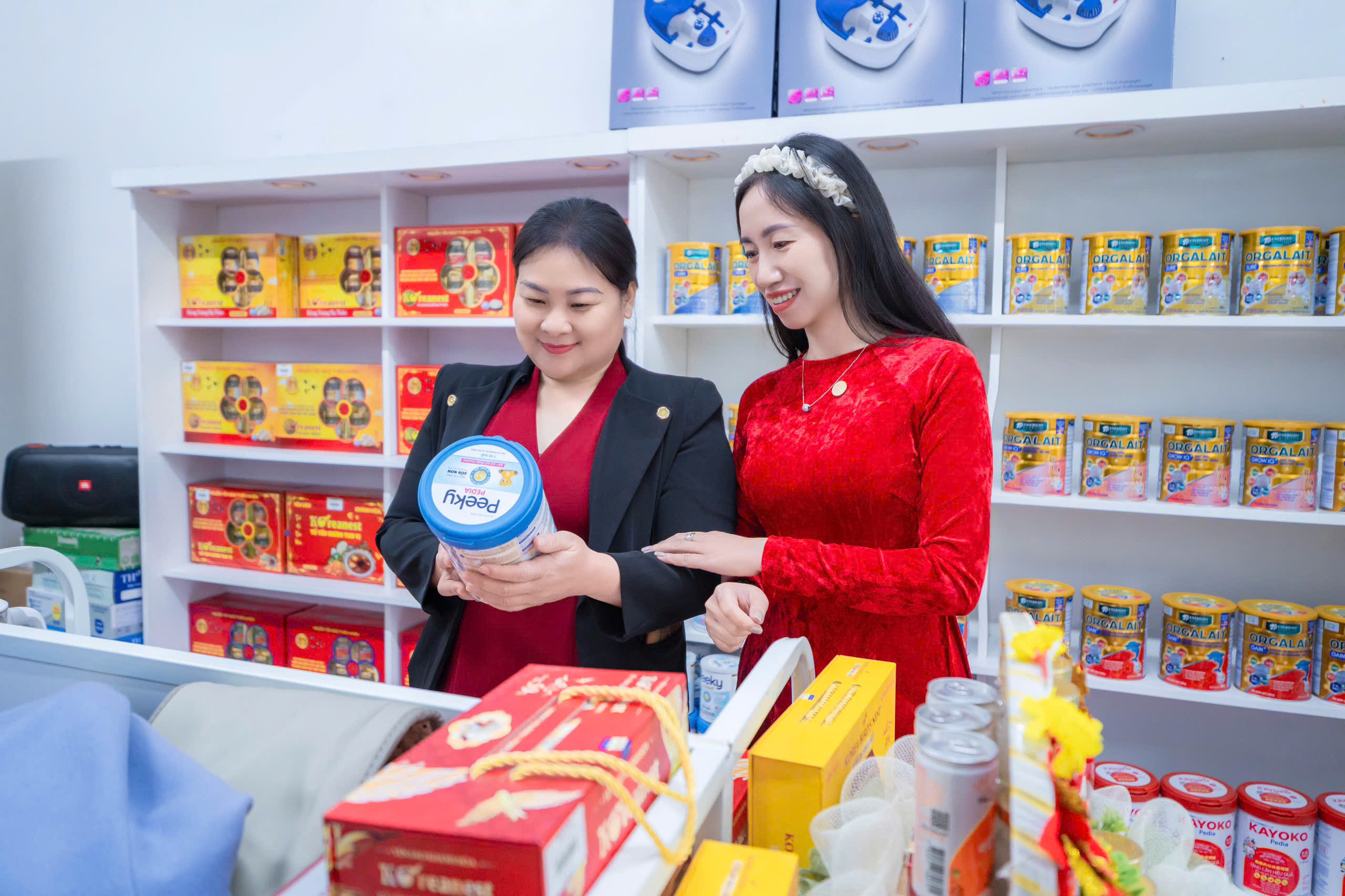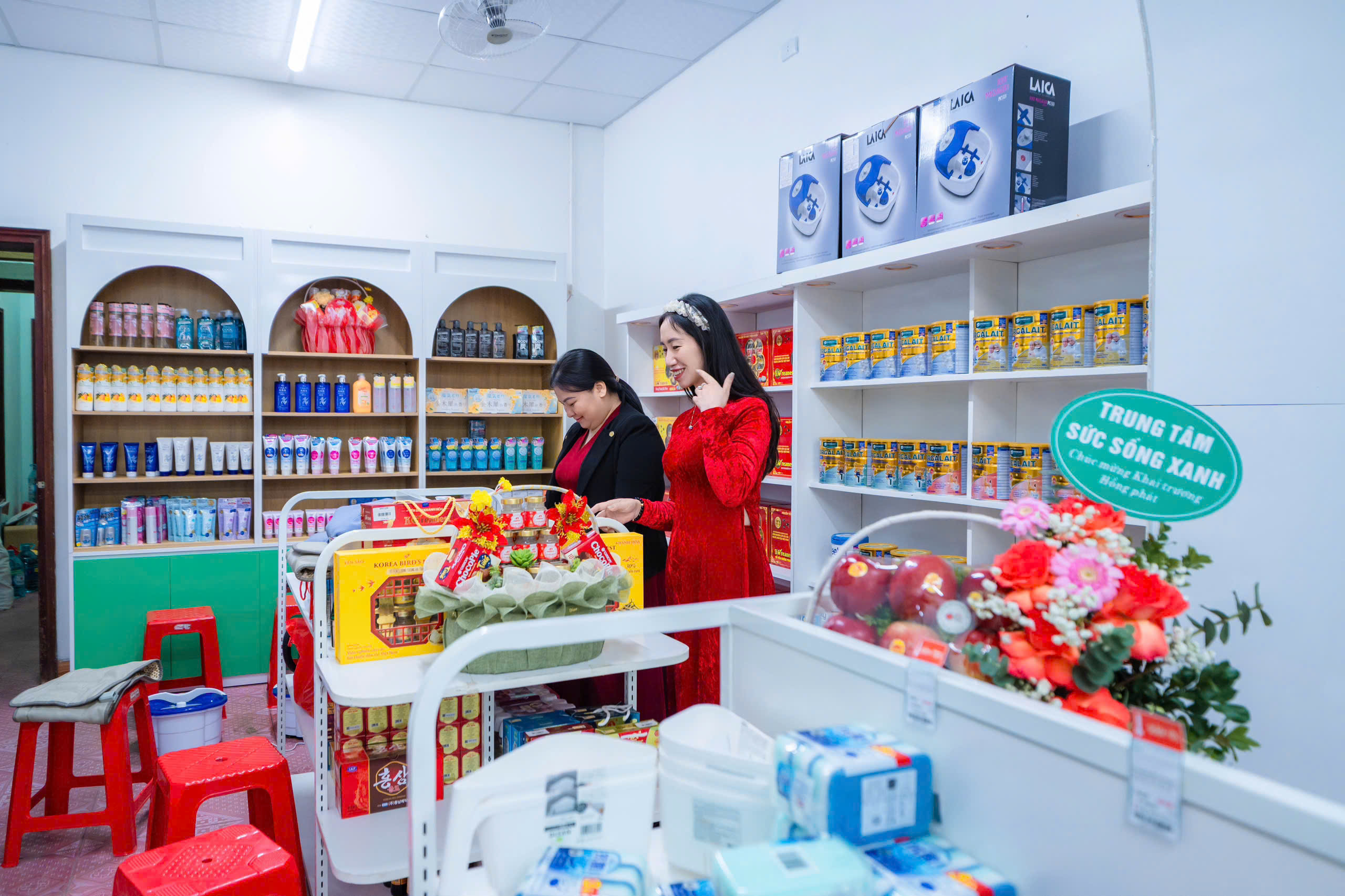 Hoa hậu Đại sứ Lê Thị Thu Thủy chúc mừng chị Nhung – chủ Nhà thuốc Sơn Tùng nhân dịp khai trương
