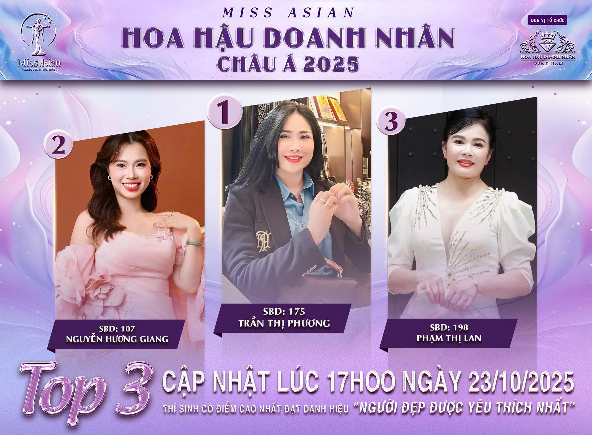 Đường đua “Người đẹp được yêu thích nhất” đang dần đi đến những chặng cuối, hứa hẹn nhiều bất ngờ vào phút chót. Ai sẽ là gương mặt giành được tình cảm lớn nhất từ công chúng để bước lên bục vinh quang? Câu trả lời sẽ sớm được hé lộ trong những ngày tới – khi Hoa hậu Doanh nhân Châu Á 2025 chính thức khởi động hành trình “nhà chung”, nơi sắc đẹp, trí tuệ và bản lĩnh doanh nhân cùng hội tụ.